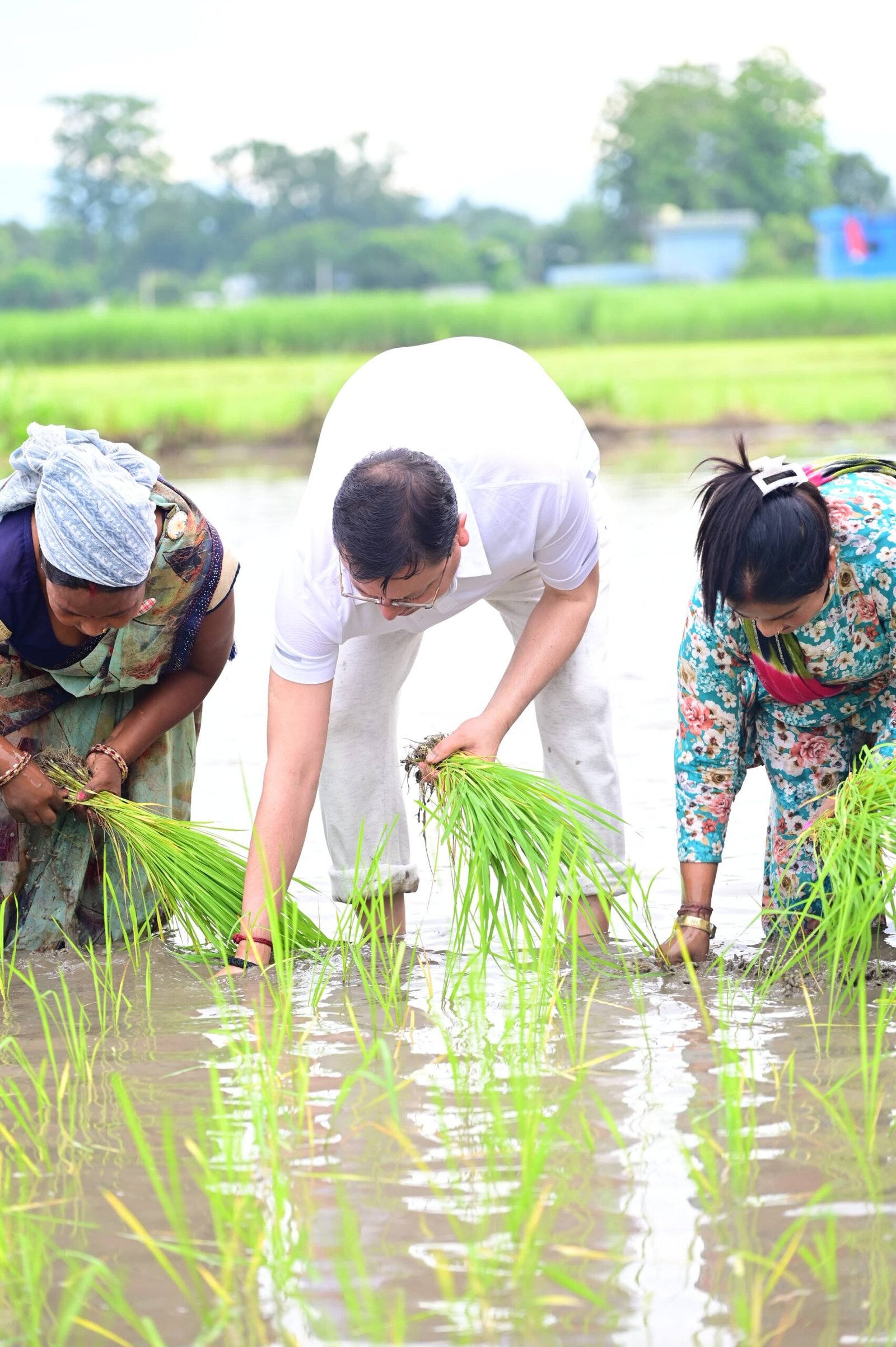 खटीमा के नगरा तराई क्षेत्र में उत्तराखंड के मुख्यमंत्री पुष्कर सिंह धामी ने शनिवार को अपने खेत में धान की रोपाई कर किसानों के परिश्रम, त्याग और समर्पण को नमन किया। उन्होंने कहा कि खेतों में उतरकर पुराने दिनों की यादें ताजा हो गईं। मुख्यमंत्री ने कहा कि अन्नदाता न केवल हमारी अर्थव्यवस्था की रीढ़ हैं, बल्कि वे हमारी संस्कृति और परंपराओं के संवाहक भी हैं।