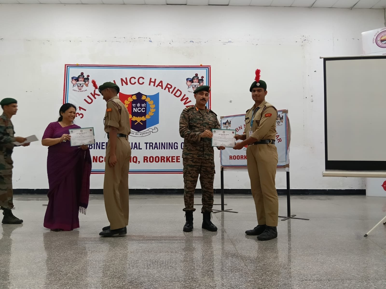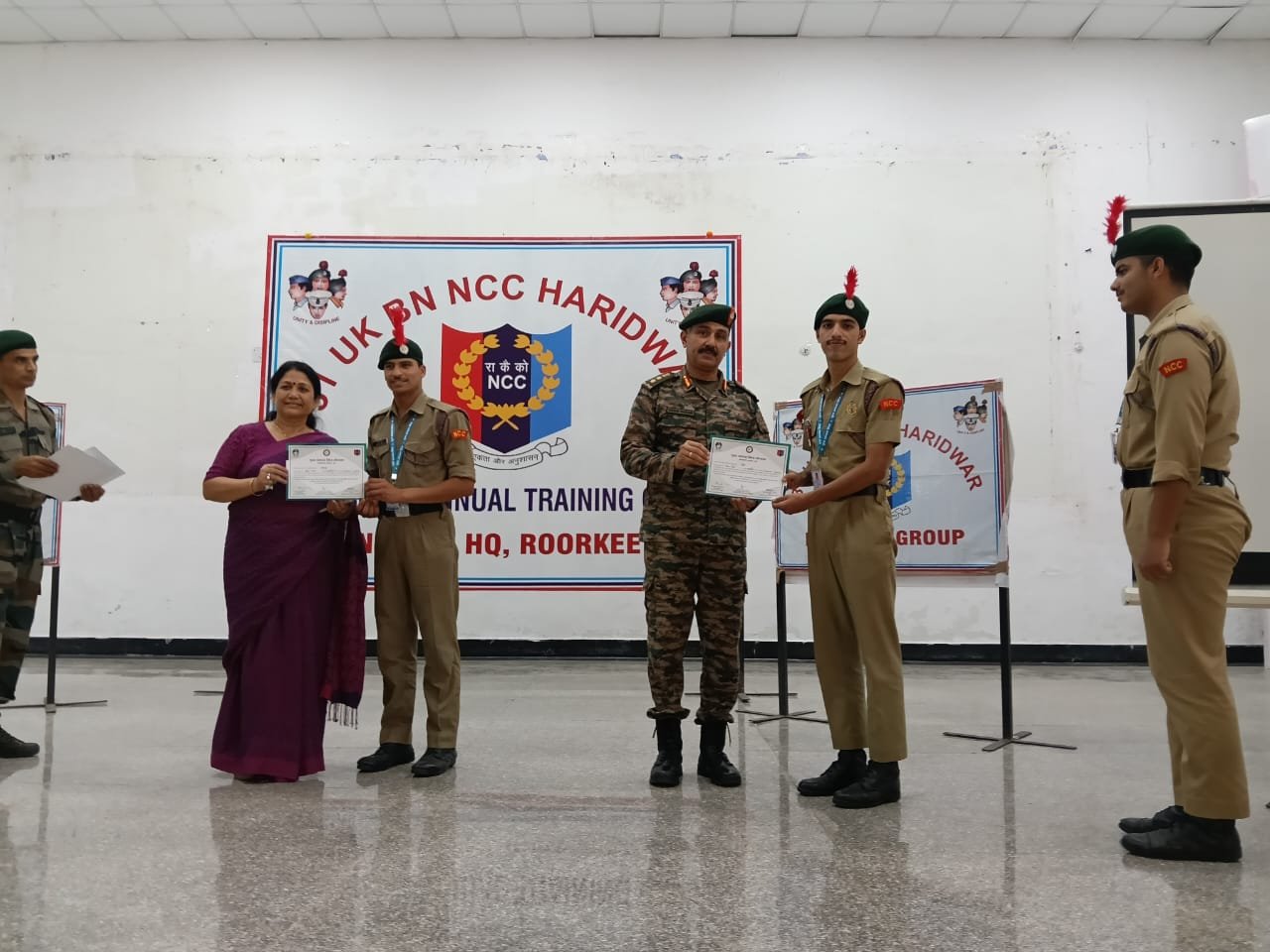 प्रशिक्षण कार्यक्रम के समापन अवसर पर कर्नल गौरव प्रसाद (NCC), आपदा प्रबंधन अधिकारी मीरा रावत एवं मास्टर ट्रेनर मनोज कंडियाल उपस्थित रहे।