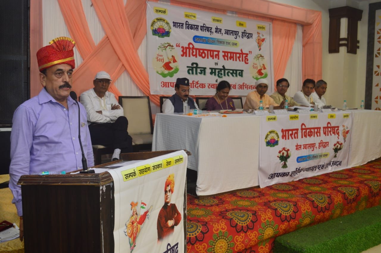 हरिद्वार। भारत विकास परिषद भेल ज्वालापुर हरिद्वार शाखा का अधिष्ठापन समारोह एवं तीज महोत्सव कार्यक्रम होटल मधुबन शंकराचार्य चौक हरिद्वार में बड़े हर्ष के साथ आयोजित किया गया। समारोह का शुभारंभ मुख्य अतिथि डॉ श्री संदीप वेदालंकार एवं अन्य विशिष्ट अतिथियों द्वारा दीप प्रज्वलन द्वारा किया गया। इसके पश्चात मुख्य अतिथि एवं अन्य अतिथियों द्वारा भारत माता एवं श्री विवेकानंद जी की मूर्ति पर माल्यार्पण किया गया! बेटी बचाओ बेटी पढ़ाओ की ब्रांड एम्बेसडर डॉ श्रीमती मनु शिवपुरी द्वारा वंदे मातरम गीत प्रस्तुत किया गया जिसमें सभी उपस्थित अतिथियों, सदस्यों, महिलाओं और बच्चों ने खड़े होकर उनका साथ दिया। डॉ मनु शिवपुरी द्वारा मंच संचालन हमारी देव वाणी संस्कृत में किया गया।ज्वालापुर की बालिका सुश्री वैष्णवी झा शास्त्रीय नृत्य प्रस्तुत किया जिसने सबका मन मोह लिया। मुख्य अतिथि, मंचासीन अन्य अतिथियों एवं अन्य शाखाओं से आए हुए दायित्वधारियों का माला और अंग वस्त्र से सम्मान किया गया।