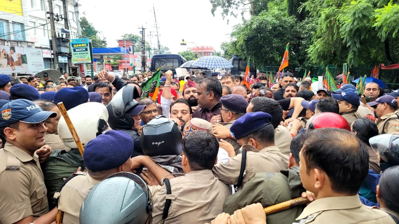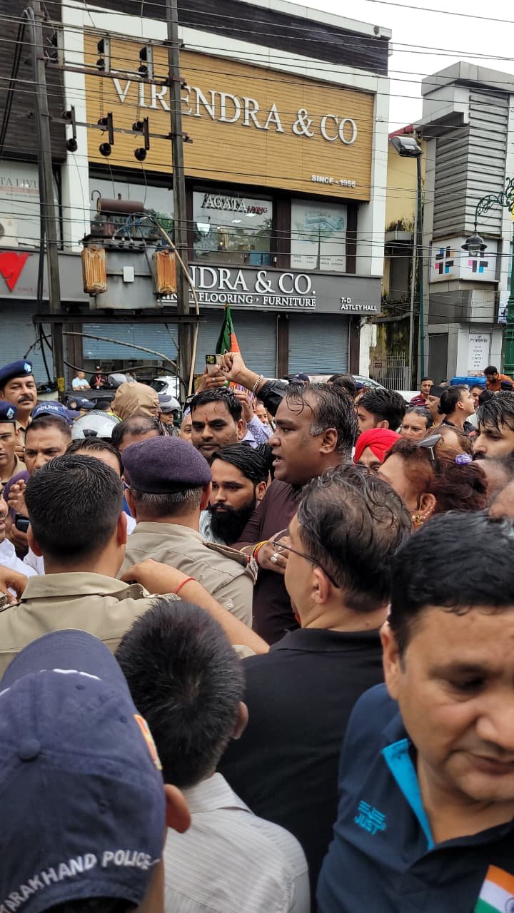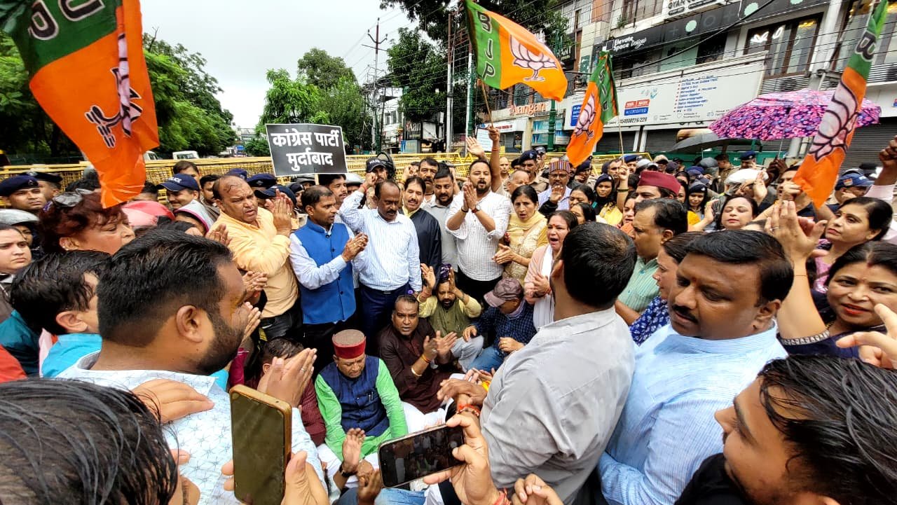 देहरादून। भारतीय जनता पार्टी महानगर देहरादून के सम्मानित अध्यक्ष श्री सिद्धार्थ अग्रवाल के नेतृत्व में राजपुर रोड देहरादून स्थित कांग्रेस भवन का घेराव किया गया। इस प्रदर्शन का मुख्य उद्देश्य कांग्रेस नेताओ द्वारा माननीय प्रधानमंत्री श्री नरेन्द्र मोदी जी की आदरणीय स्वर्गीय माता जी के प्रति की गई अमर्यादित एवं अपमानजनक टिप्पणी के विरोध को दर्ज कराना था।