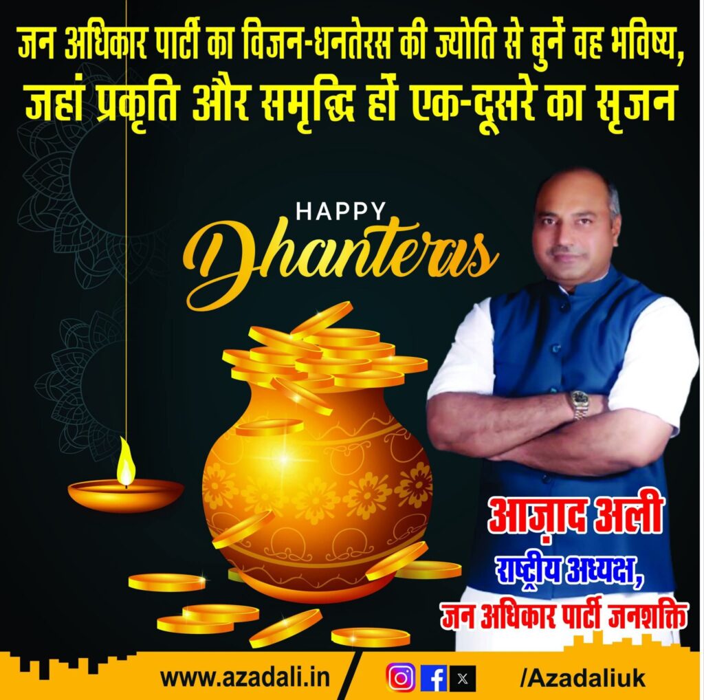 जन अधिकार पार्टी के राष्ट्रीय अध्यक्ष आज़ाद अली ने देशवासियों को धनतेरस की शुभकामनायें दी हैं।