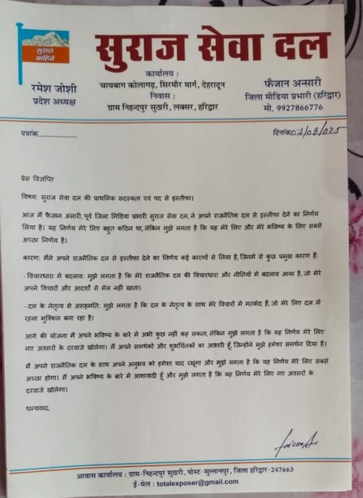 फैज़ान अंसारी पूर्व जिला मिडिया प्रभारी सुराज सेवा दल, ने अपने साथियो के साथ सुराज सेवा दल से अपना इस्तीफा राष्ट्रीय अध्यक्ष को सौंपा।