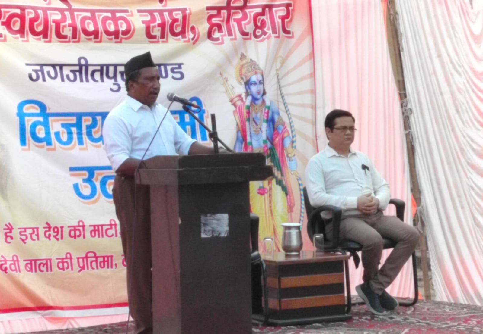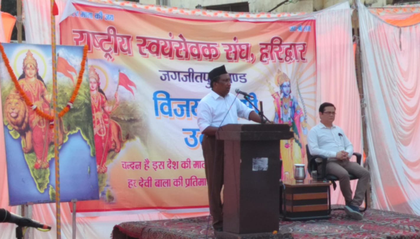 जगजीतपुर खण्ड के नवीन मंडी हरिलोक कालोनी में आयोजित कार्यक्रम में अखिल भारतीय सह सेवा प्रमुख राजकुमार मटाले ने कहा कि आज से 100 वर्ष पहले डॉ. हेडगवार ने अपने 5 मित्रों के साथ मिलकर राष्ट्रीय स्वयंसेवक संघ की स्थापना विजयदशमी के पर्व पर की। तब से निरंतर हिन्दू समाज को संगठित करने के लिए समाज परिवर्तन का कार्य कर रहा है।
