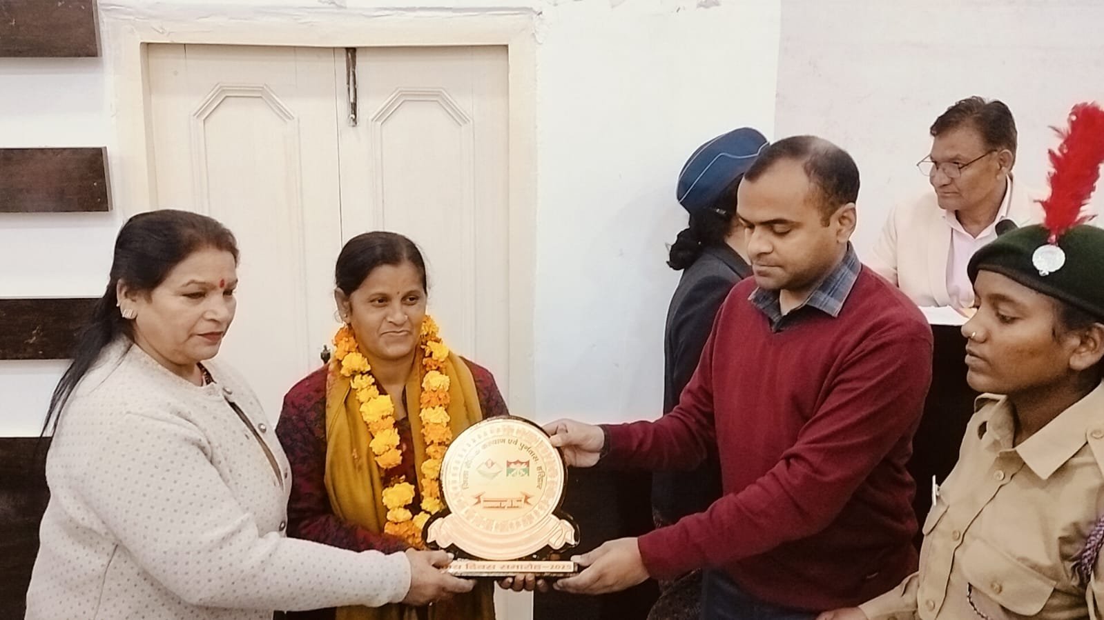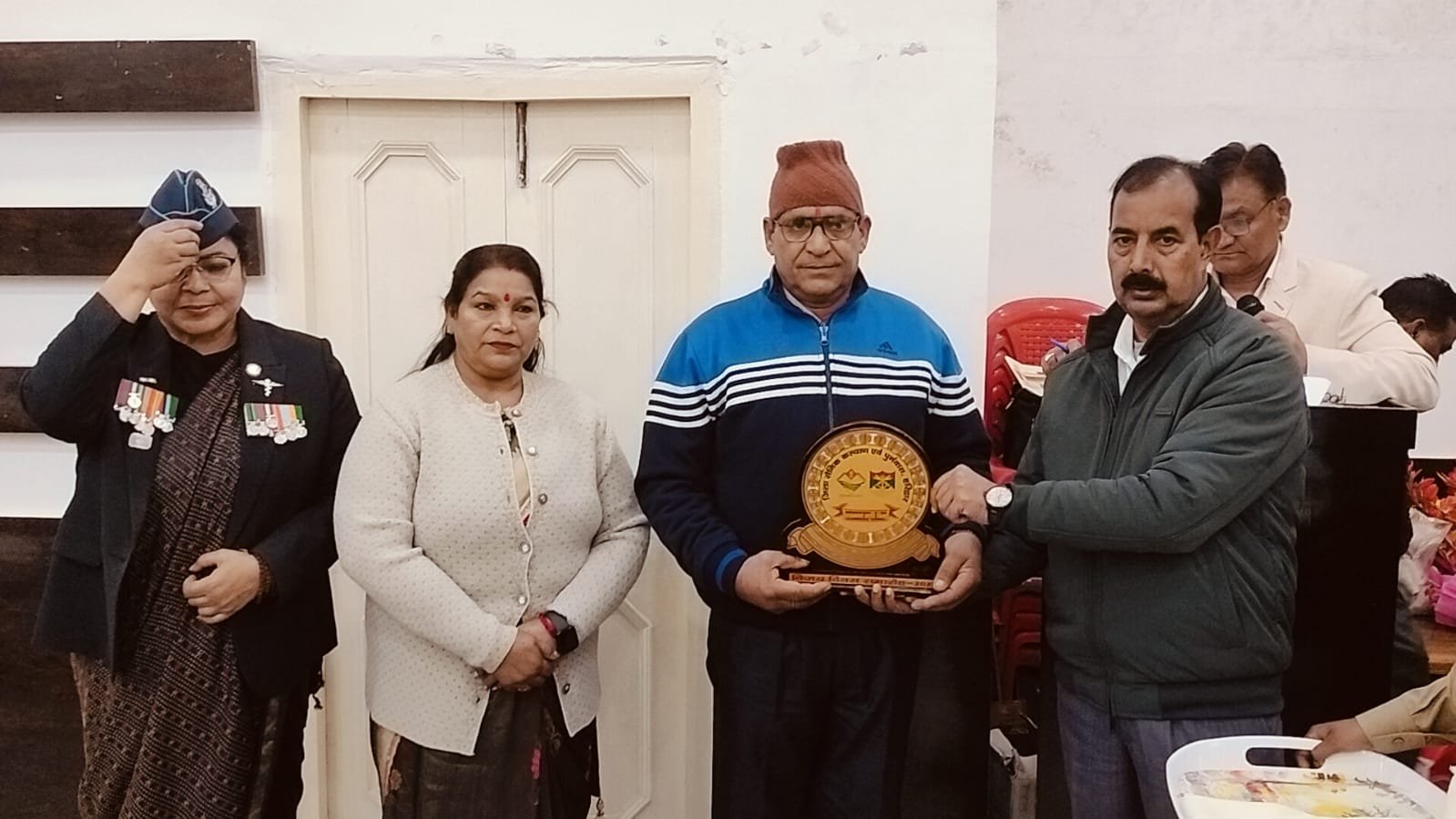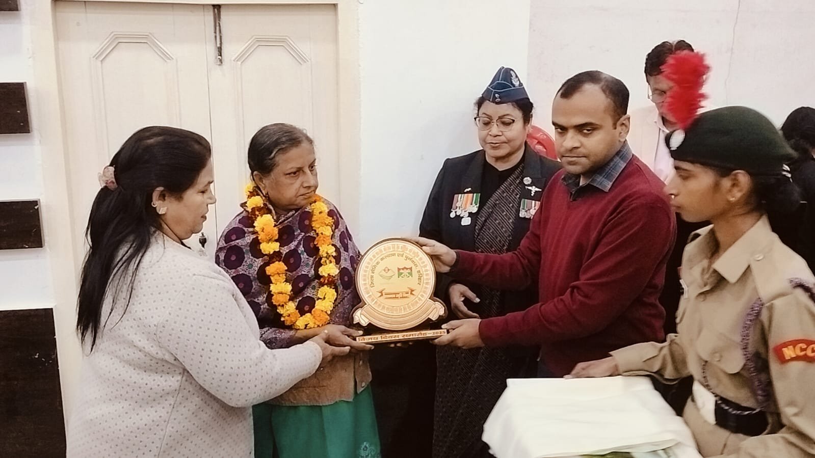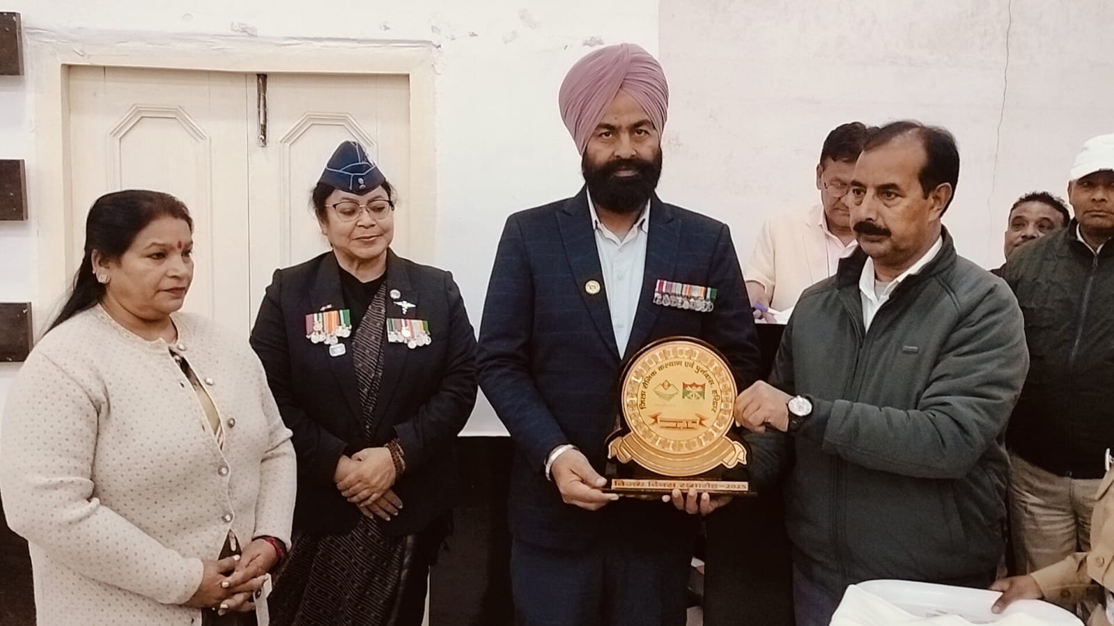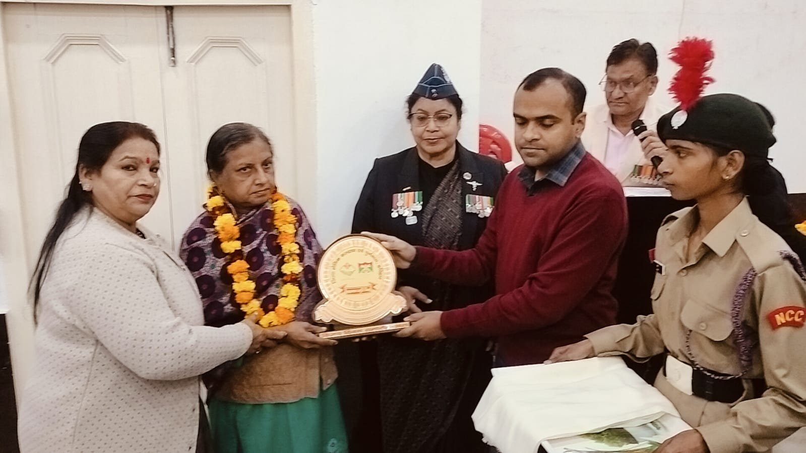 जिसमें श्रीमती मीशा देवी राइफलमैन स्वर्गीय मनोज सिंह,श्रीमती मंजू त्यागी नायक राधे श्याम,श्रीमती शिला देवी सिपाही पारस नाथ,श्रीमती माहेश्वरी देवी सूबेदार राजे सिंह नेगी,श्रीमती मिथलेश देवी सिपाही बृजपाल सिंह,श्रीमती गीता सैनी हवलदार सोनित कुमार सैनी,पूर्वानिक कुंवर सिंह,मुकेश कुमार,जगदीश प्रसाद, जरीफ अहमद ,दुर्गा दत्त,रामेश्वर प्रसाद आदि को स्मृति चिन्ह एवं शॉल भेंटकर सम्मानित किया।
