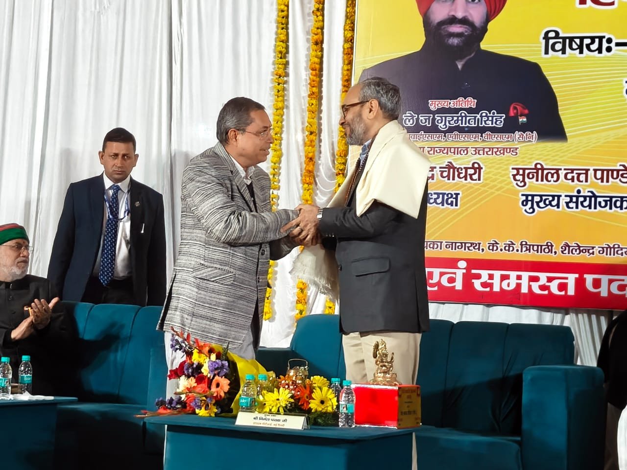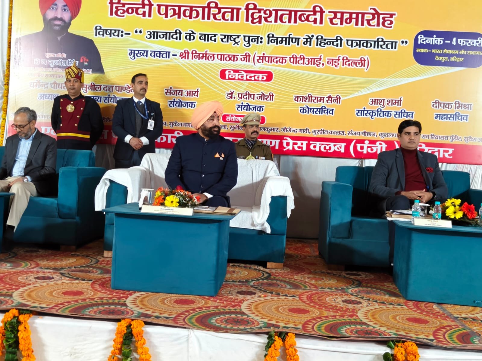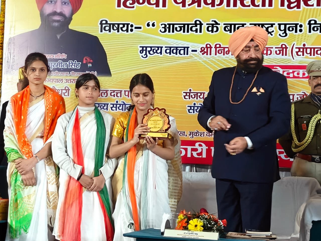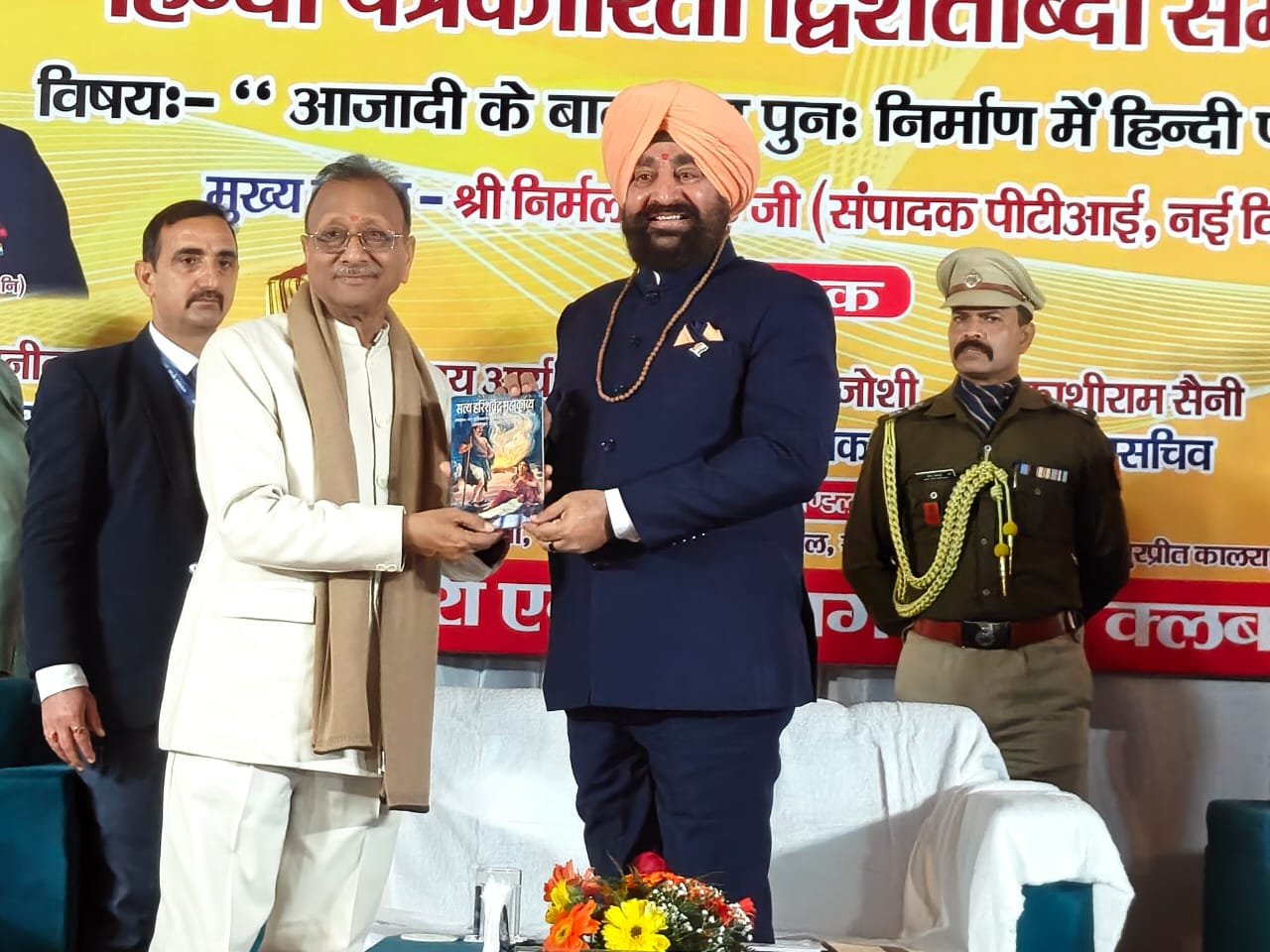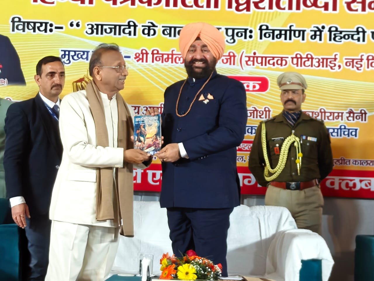 हरिद्वार। प्रेस क्लब द्वारा हिंदी पत्रकारिता द्वि शताब्दी समारोह में आजादी के बाद राष्ट्र पुनः निर्माण में हिंदी पत्रकारिता विषय संगोष्ठी का आयोजन किया गया। देवपुरा चौक स्थित भारत सेवाश्रम के सभागार में आयोजित संगोष्ठी का शुभारंभ मुख्य अतिथि राज्यपाल लेफ्टिनेंट जनरल गुरमीत सिंह (से.नि.) ने दीप प्रज्वलित कर किया। प्रेस क्लब अध्यक्ष धर्मेंद्र चौधरी एवं महामंत्री दीपक मिश्रा ने राज्यपाल लेफ्टिनेंट जनरल गुरमीत सिंह को बुके देकर सम्मानित किया। इस दौरान वरिष्ठ पत्रकार सुनील दत्त पांडे द्वारा राज्यपाल की उपलब्धियों एवं अनुकरणीय योगदान से अवगत कराया। मंच का संचालन वरिष्ठ पत्रकार संजय आर्य ने किया। सरस्वती शिशु मंदिर की छात्राओं ने राष्ट्रगान की प्रस्तुति दी। राज्यपाल लेफ्टिनेंट गुरमीत सिंह ने समारोह को संबोधित करते हुए कहा कि हिंदी पत्रकारिता का सामाजिक चेतना, मूल्यों और सिद्धांतों के साथ राष्ट्रहित में परिवर्तन जीवन और राष्ट्र की प्रगति, आध्यात्मिक, सामाजिक विकास के साथ भारत की आजादी में महत्वपूर्ण योगदान है।