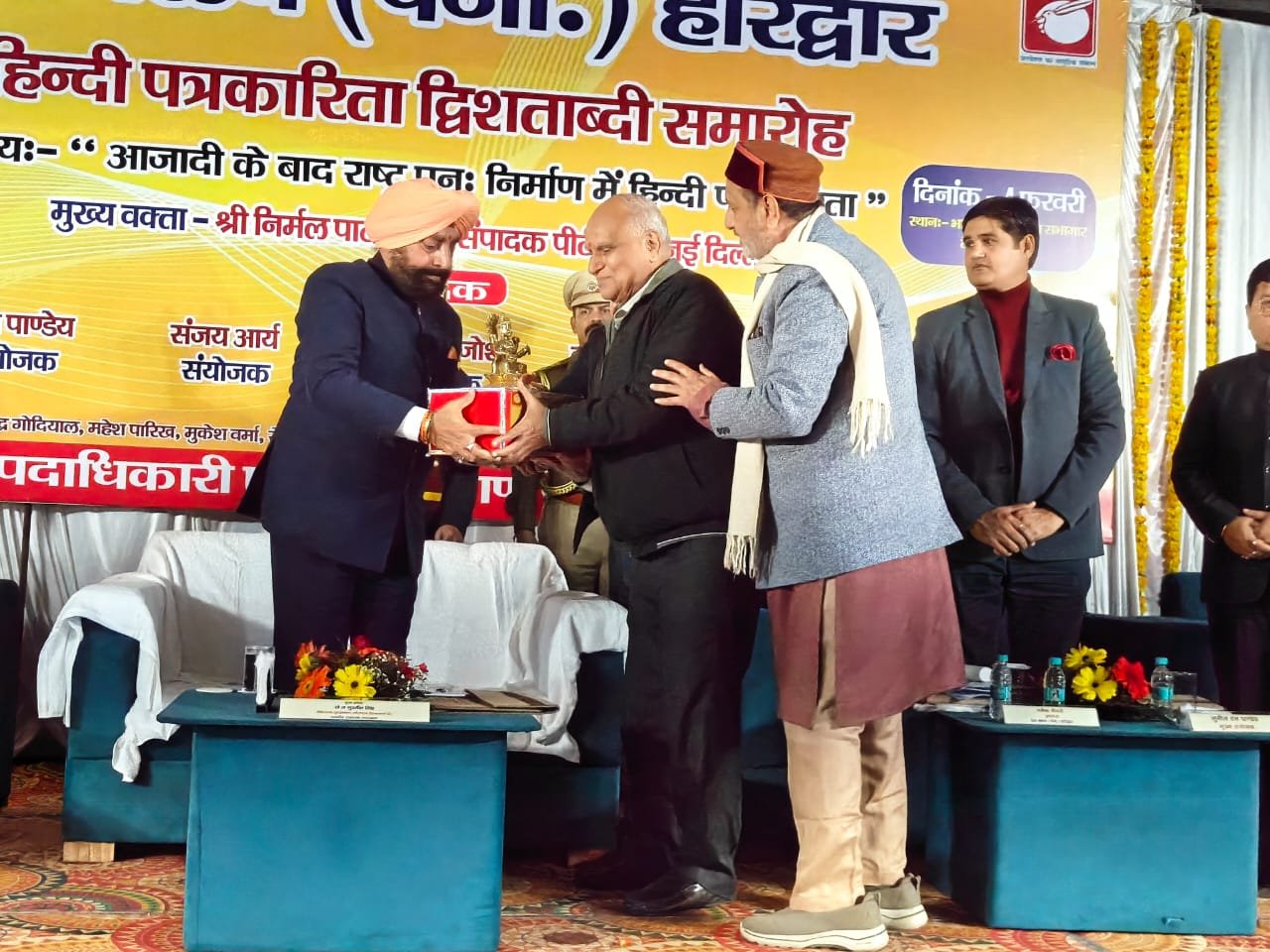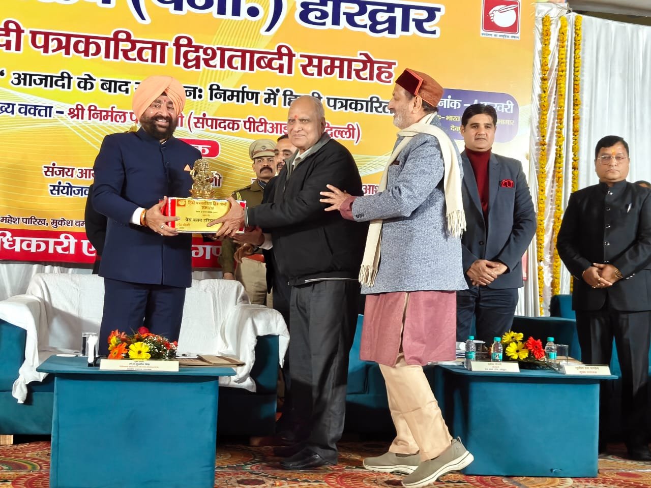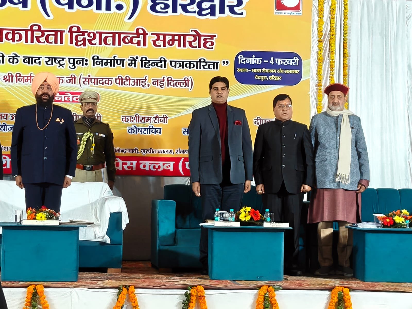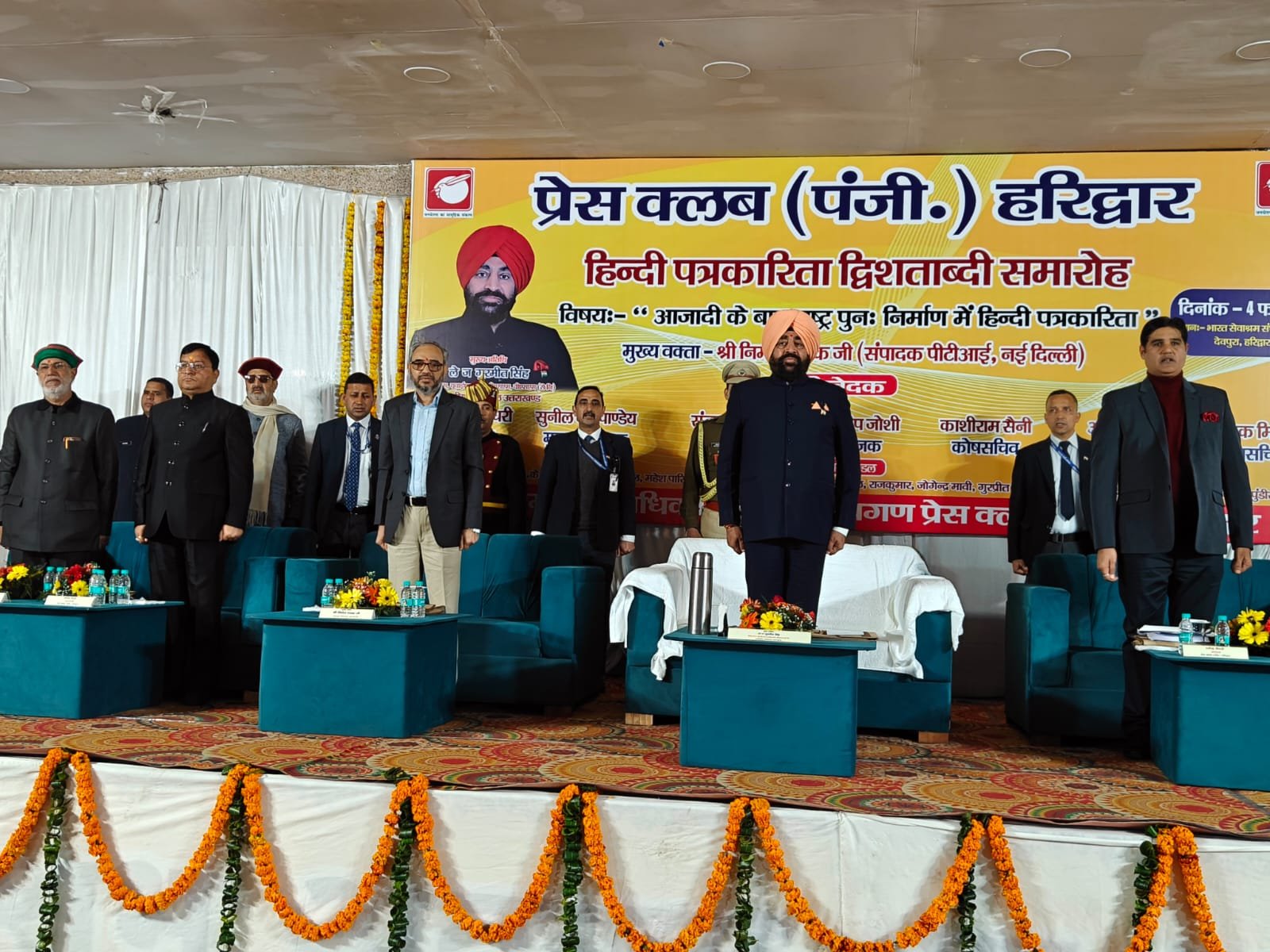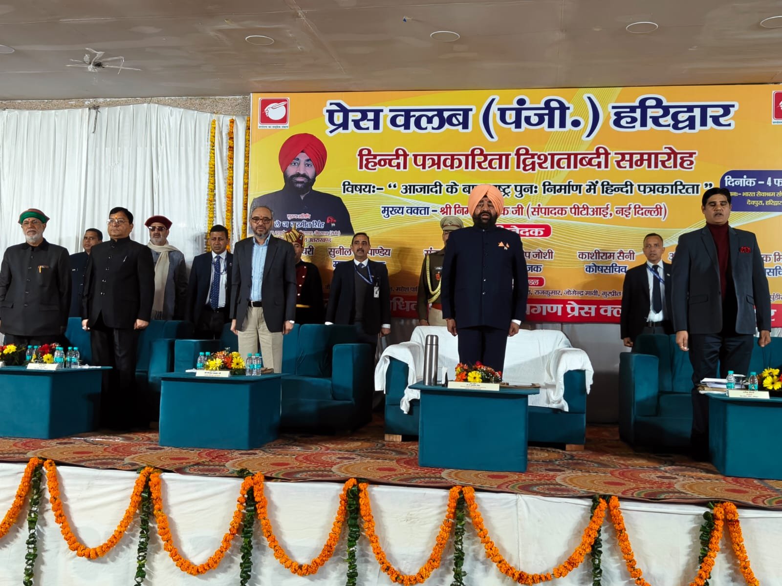 हरिद्वार। प्रेस क्लब द्वारा हिंदी पत्रकारिता द्वि शताब्दी समारोह में आजादी के बाद राष्ट्र पुनः निर्माण में हिंदी पत्रकारिता विषय संगोष्ठी का आयोजन किया गया। देवपुरा चौक स्थित भारत सेवाश्रम के सभागार में आयोजित संगोष्ठी का शुभारंभ मुख्य अतिथि राज्यपाल लेफ्टिनेंट जनरल गुरमीत सिंह (से.नि.) ने दीप प्रज्वलित कर किया। प्रेस क्लब अध्यक्ष धर्मेंद्र चौधरी एवं महामंत्री दीपक मिश्रा ने राज्यपाल लेफ्टिनेंट जनरल गुरमीत सिंह को बुके देकर सम्मानित किया। इस दौरान वरिष्ठ पत्रकार सुनील दत्त पांडे द्वारा राज्यपाल की उपलब्धियों एवं अनुकरणीय योगदान से अवगत कराया। मंच का संचालन वरिष्ठ पत्रकार संजय आर्य ने किया। सरस्वती शिशु मंदिर की छात्राओं ने राष्ट्रगान की प्रस्तुति दी। राज्यपाल लेफ्टिनेंट गुरमीत सिंह ने समारोह को संबोधित करते हुए कहा कि हिंदी पत्रकारिता का सामाजिक चेतना, मूल्यों और सिद्धांतों के साथ राष्ट्रहित में परिवर्तन जीवन और राष्ट्र की प्रगति, आध्यात्मिक, सामाजिक विकास के साथ भारत की आजादी में महत्वपूर्ण योगदान है।