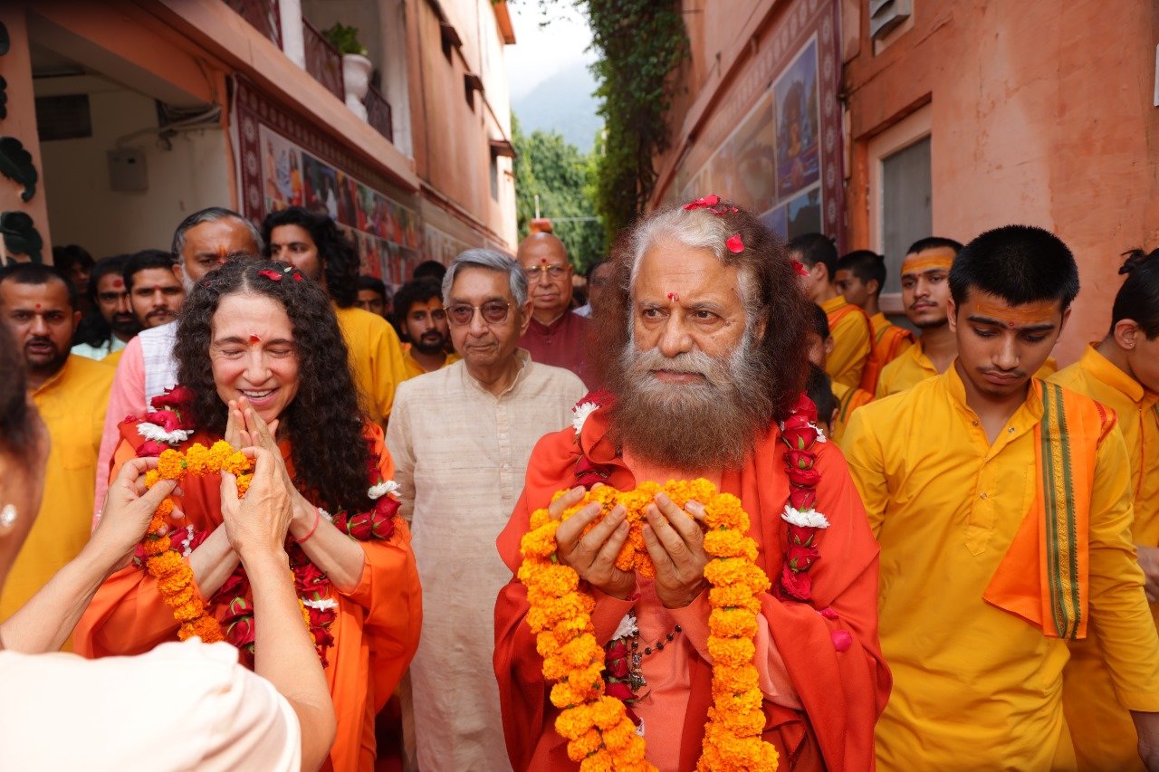 परमार्थ निकेतन परिवार ने वेदमंत्रों, शंखध्वनि और पुष्पवर्षा कर किया भव्य व दिव्य अभिनन्दन