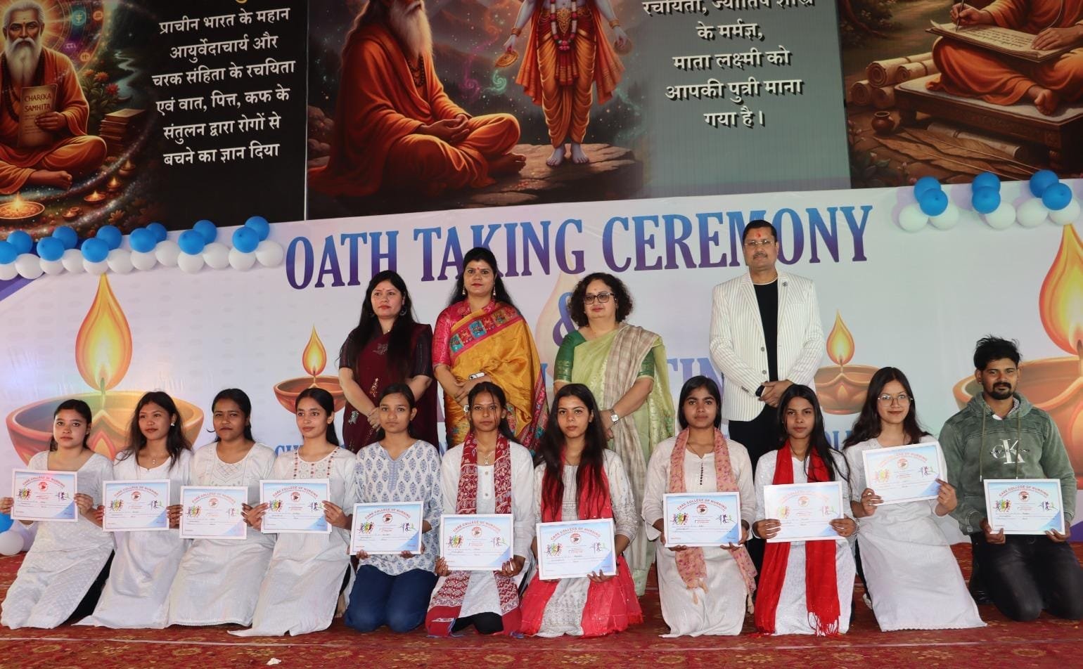 डॉ. स्मृति अरोड़ा ने अपने प्रेरणादायी संबोधन में नर्सिंग पेशे की गरिमा, अनुशासन, करुणा एवं समर्पण पर बल देते हुए कहा कि नर्सिंग केवल एक व्यवसाय नहीं, बल्कि मानव सेवा का श्रेष्ठ माध्यम है। शपथ ग्रहण के दौरान विद्यार्थियों ने निष्ठा, ईमानदारी एवं पूर्ण समर्पण से रोगियों की सेवा करने तथा व्यावसायिक आचार-संहिता का पालन करने का संकल्प लिया।